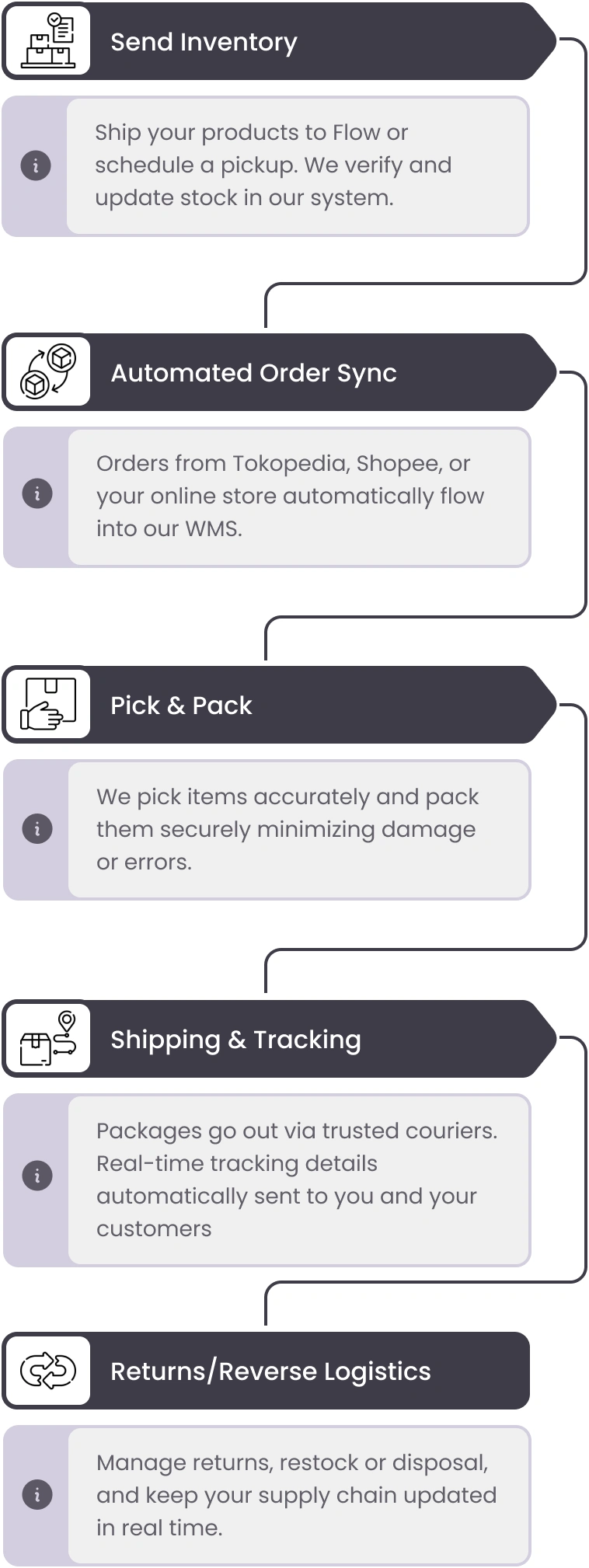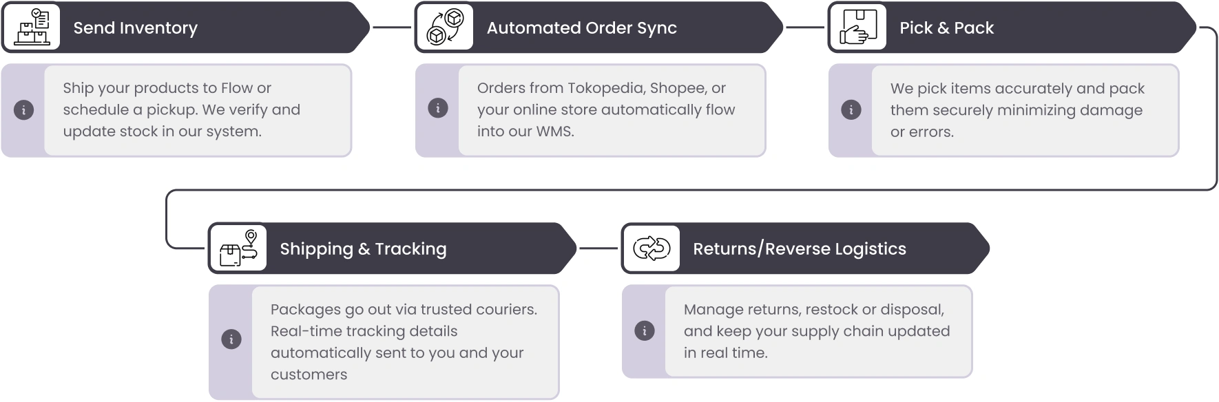 No need to rent or operate your own warehouse—Flow reduces overheads by handling storage, staffing, and operations for you.